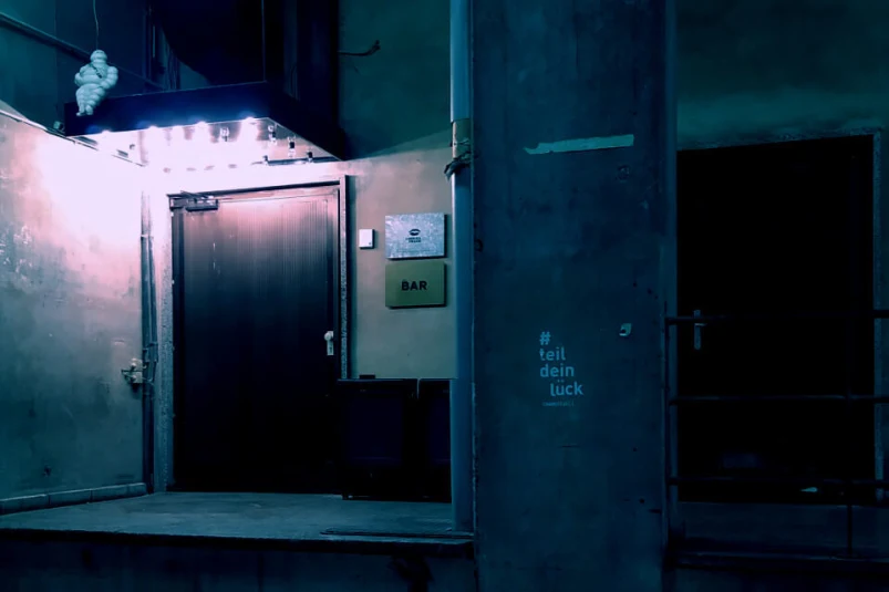 It is a December 30th. It is 10 pm. It is 2 degrees. I walk between the industrial buildings, in a dark backyard a few steps from the Friedrichstrasse. There is nobody there. In the recess of a concrete wall is a door, dimly lit. When you get close enough, you see a bell next to the closed door.