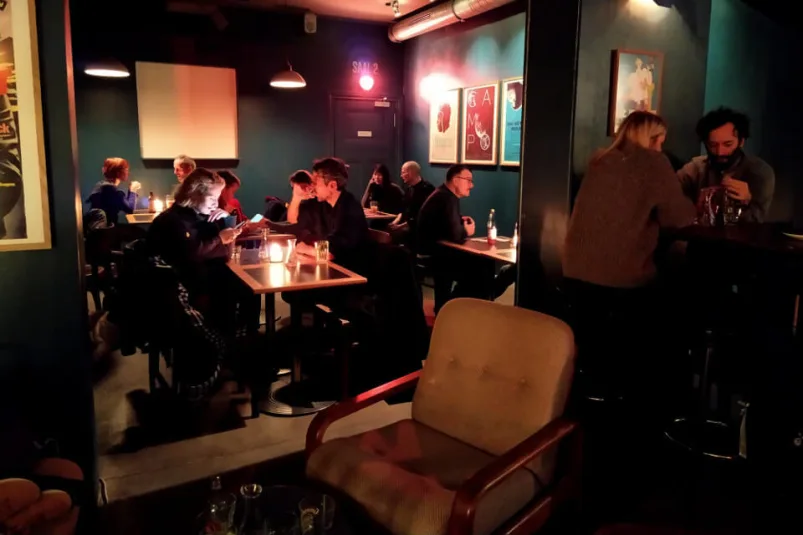 Fünfzig Leute kommen herein, tauschen ein Wort mit dem Kellner aus und verschwinden. Die Szene fasziniert dich. Du gehst zum Ende dieses Ganges, siehst aber nichts, nur die Toiletten, die nicht groß genug für Empfänge von 50 Leuten sind. Und dann schärfst du deine Augen und dann, hinter einem Vorhang, verstehst du es. Du kommst zurück und setzt dich zu deinem Bier und alles leuchtet auf. Nun kannst du sie sehen, die beiden Räume, die im Dekor des Wolf versteckt sind, kaum sichtbar, und das Programm, das über der Theke ausgestellt ist. Das Wolf Kino.
